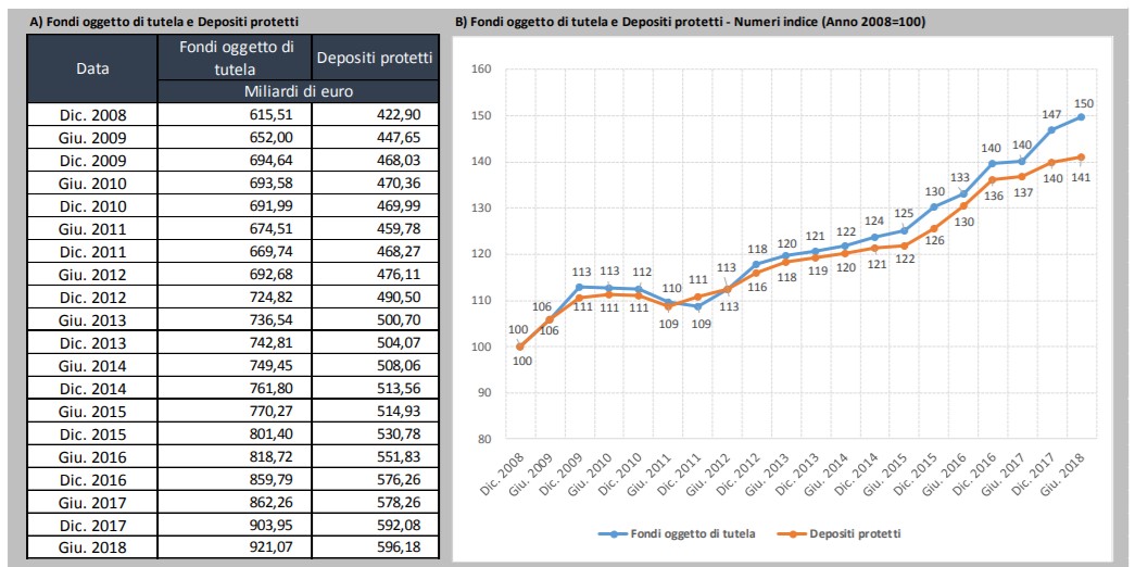 Nel grafico sopra, vedete anche che gli importi che il Fondo di Tutela dovrebbe garantire sono in costante aumento nel corso del tempo. Evidentemente, la gente si fida della garanzia promessa, e lascia sempre più soldi sui conti correnti, senza rendersi conto del potenziale rischio…