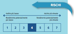 Tutte le informazioni sopra riportate vengono esplicitate obbligatoriamente nel Kiid (“Key Investor Informations Document”, cioè documento che contiene informazioni importanti per l’investitore), che è un po’ il bugiardino dei prodotti finanziari: tale documento deve essere consegnato prima di ogni decisione di investimento. In quello stesso documento, tra l’altro, viene indicato anche il grado di rischio stimato per il prodotto, su una scala che va da 1 a 7 (prevista dalle normative europee). Nel caso del fondo di cui stiamo parlando, il profilo di rischio è quello riportato nell’immagine accanto: livello 4 su 7. Un valore che sarebbe decisamente troppo elevato in presenza di uno strumento finanziario con la garanzia sul 100% del patrimonio…